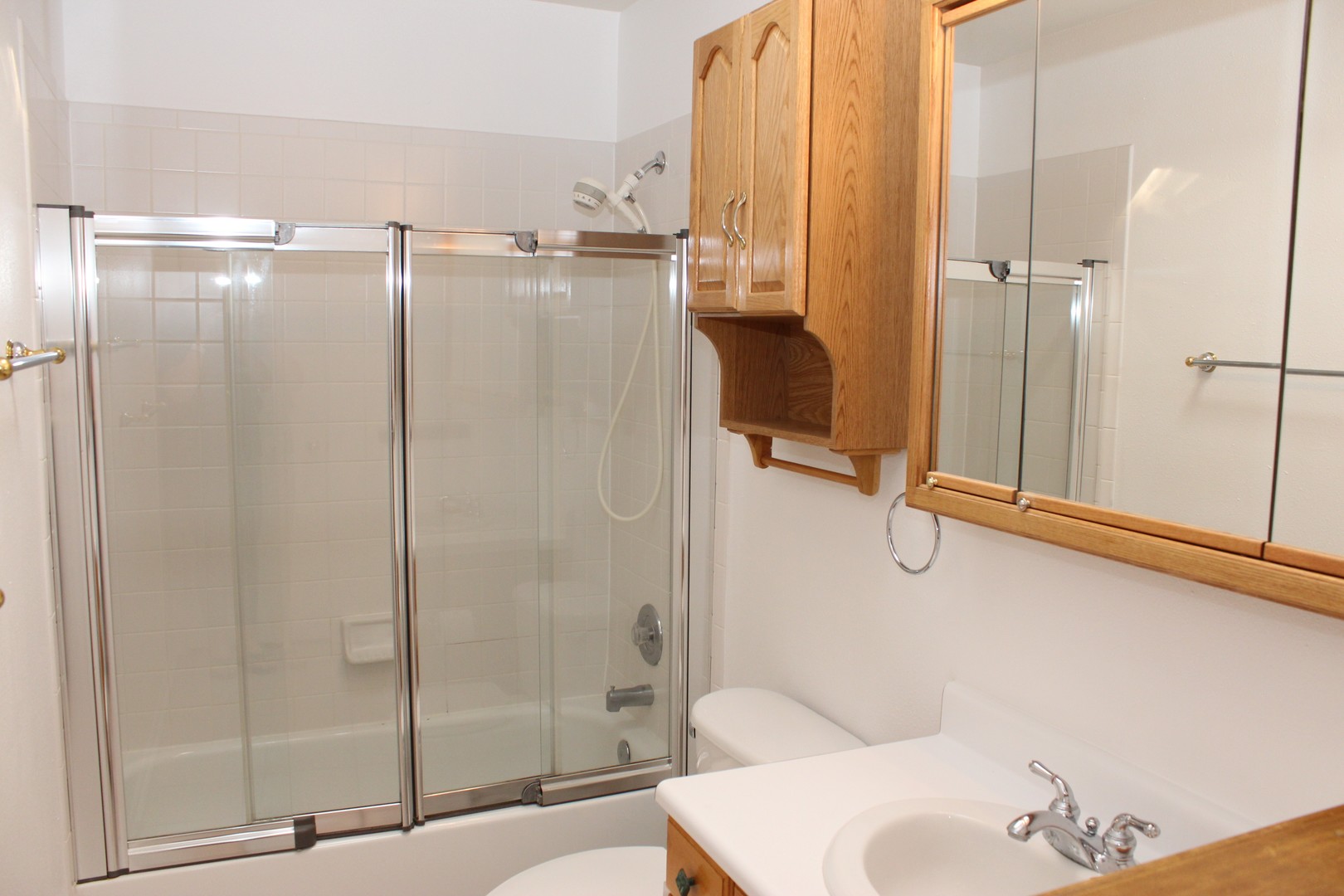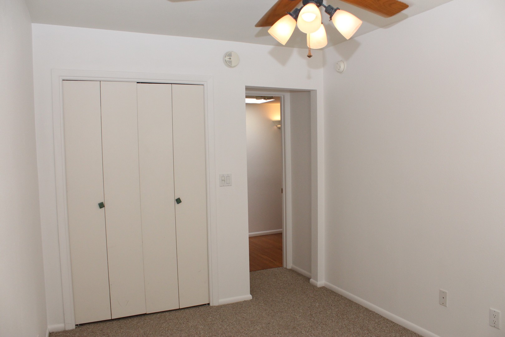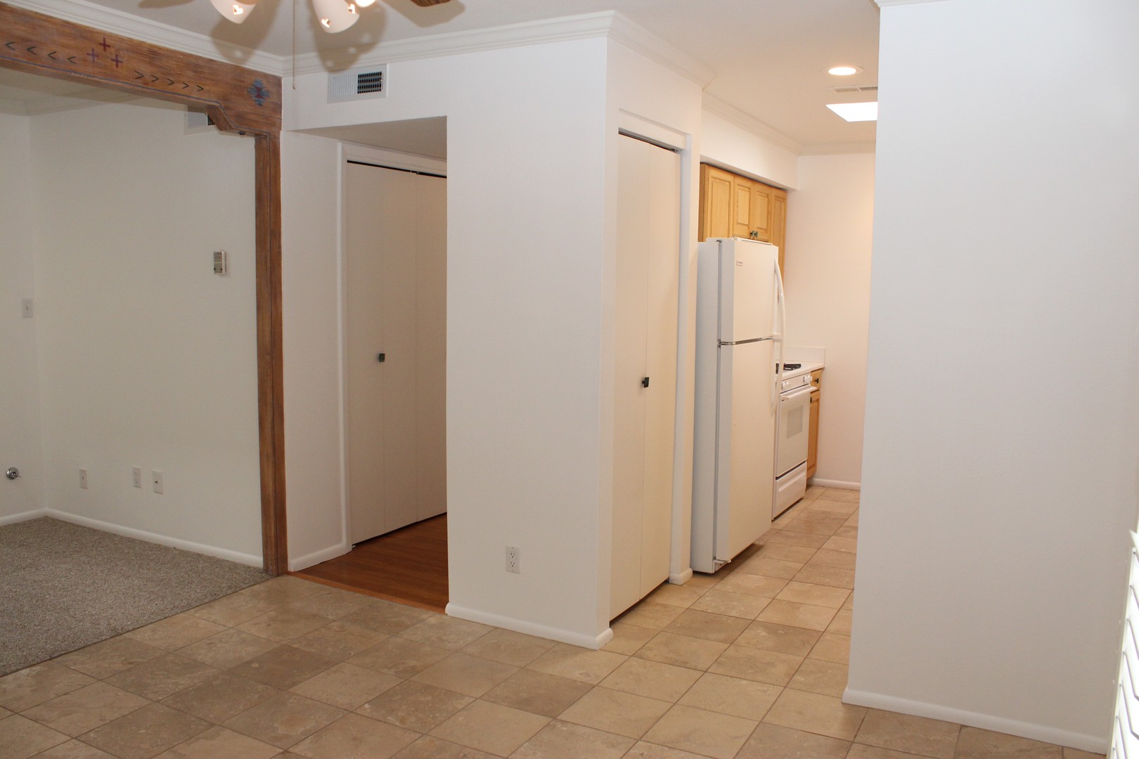 This unit has tile floors in dining room & kitchen and carpet in living area & bedrooms. Full bath at end of hall.