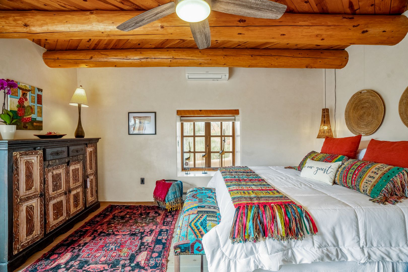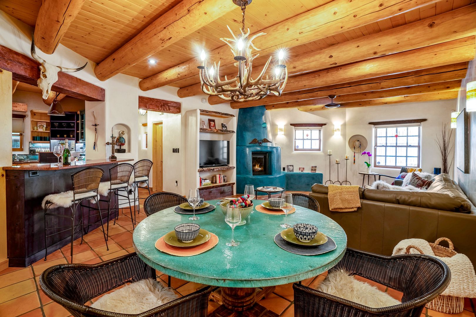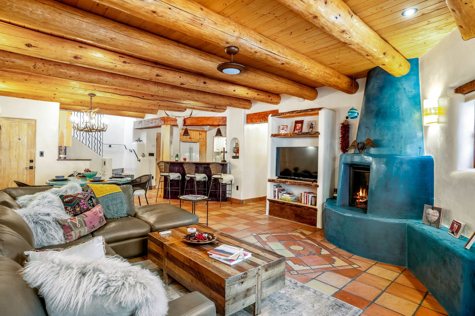 Step into an inviting living room with Kiva fireplace, beautiful artwork and lovely furnishings to make your stay a "Perfect Santa Fe Stay!"