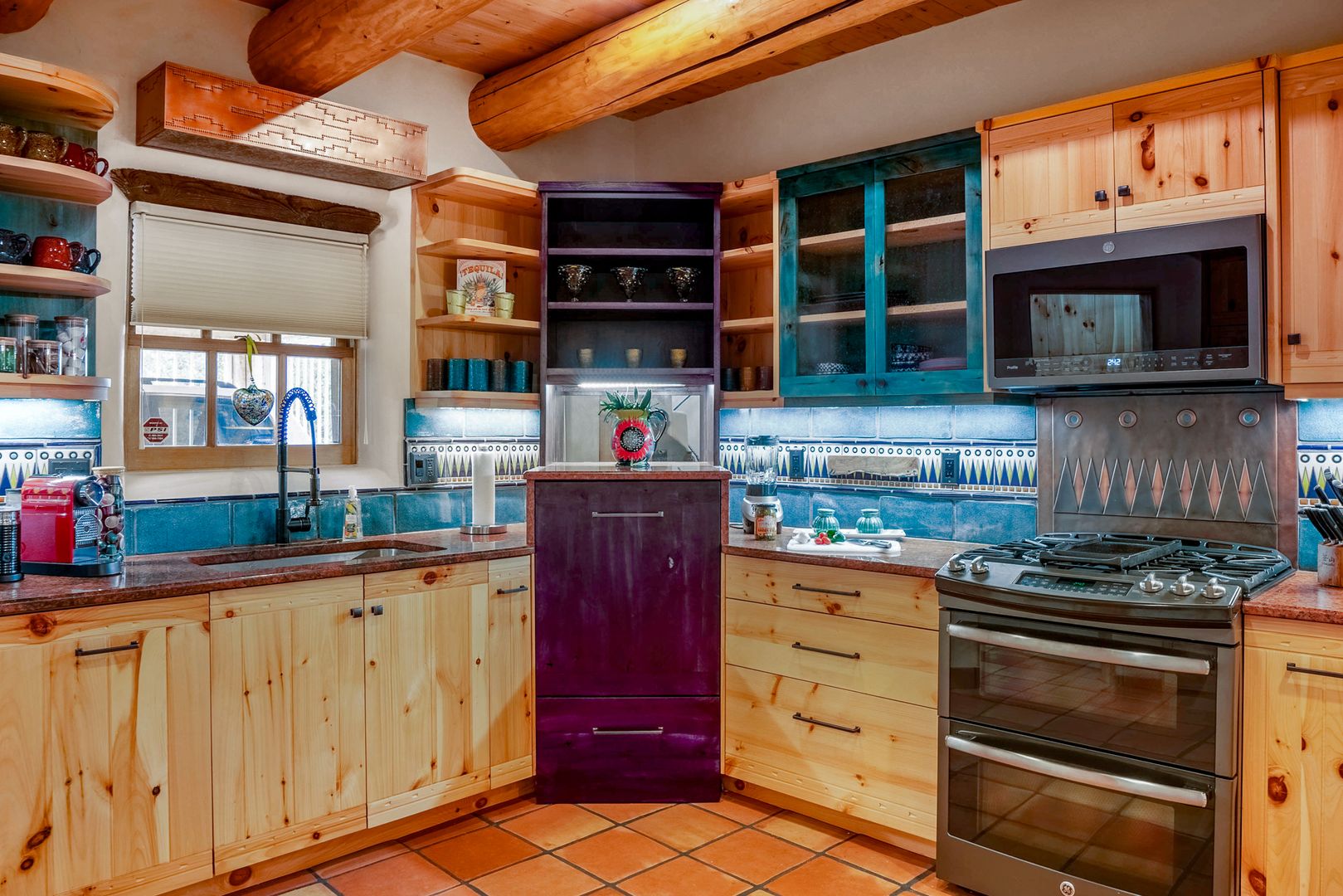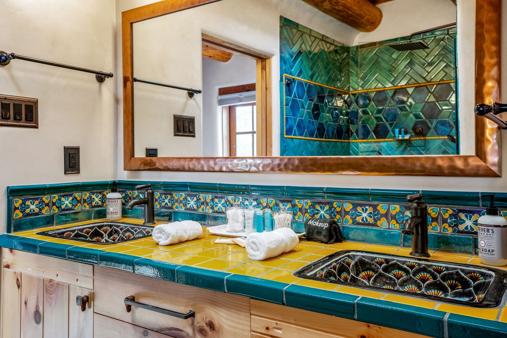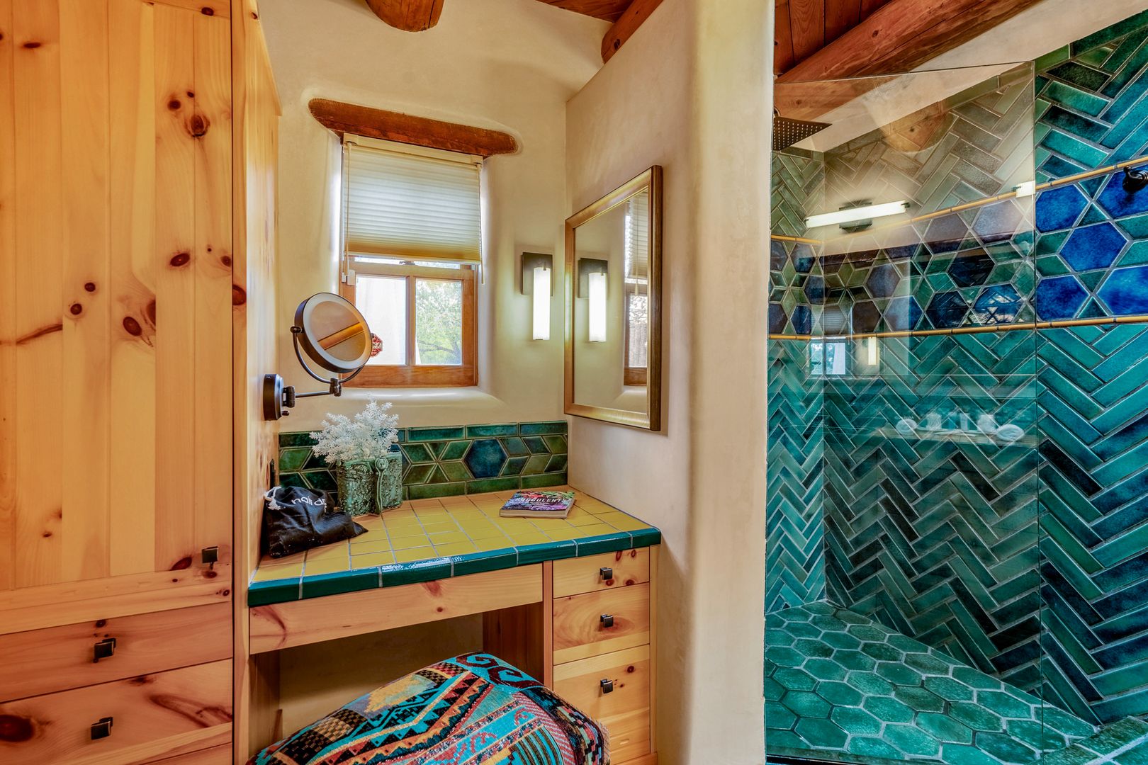 Step into an inviting living room with Kiva fireplace, beautiful artwork and lovely furnishings to make your stay a "Perfect Santa Fe Stay!"