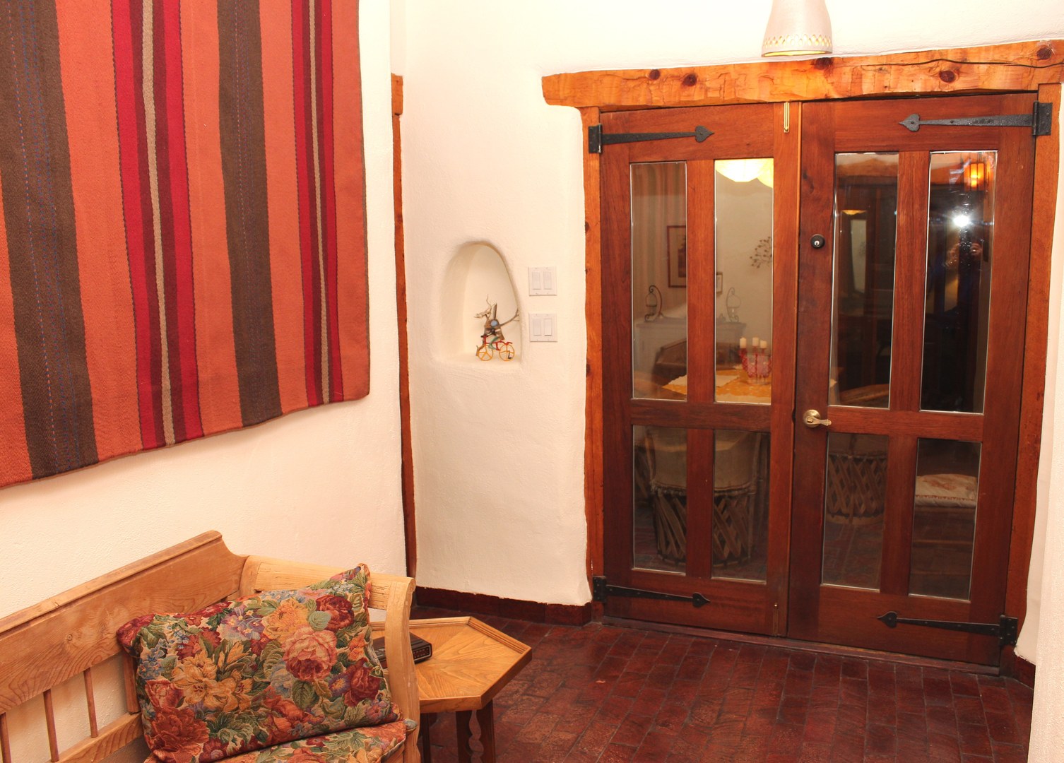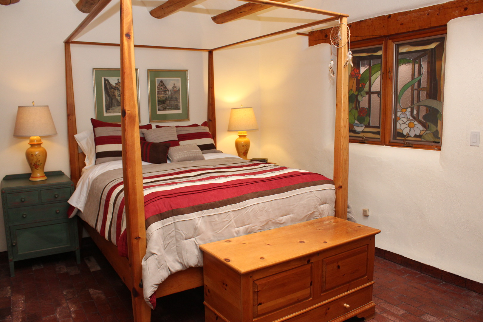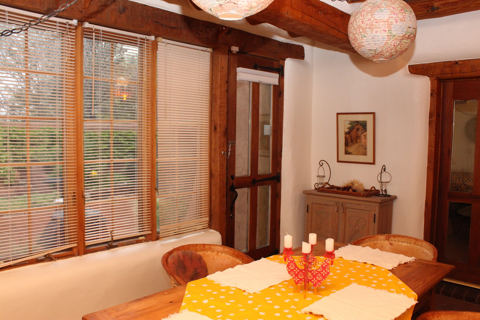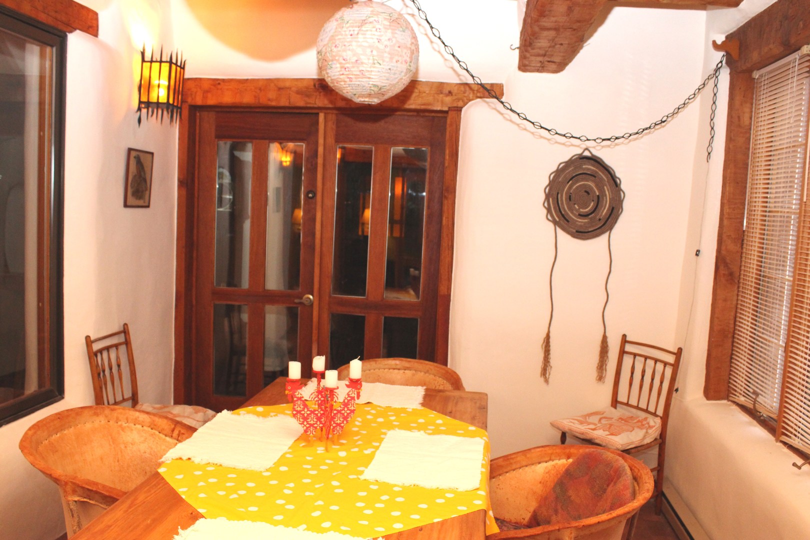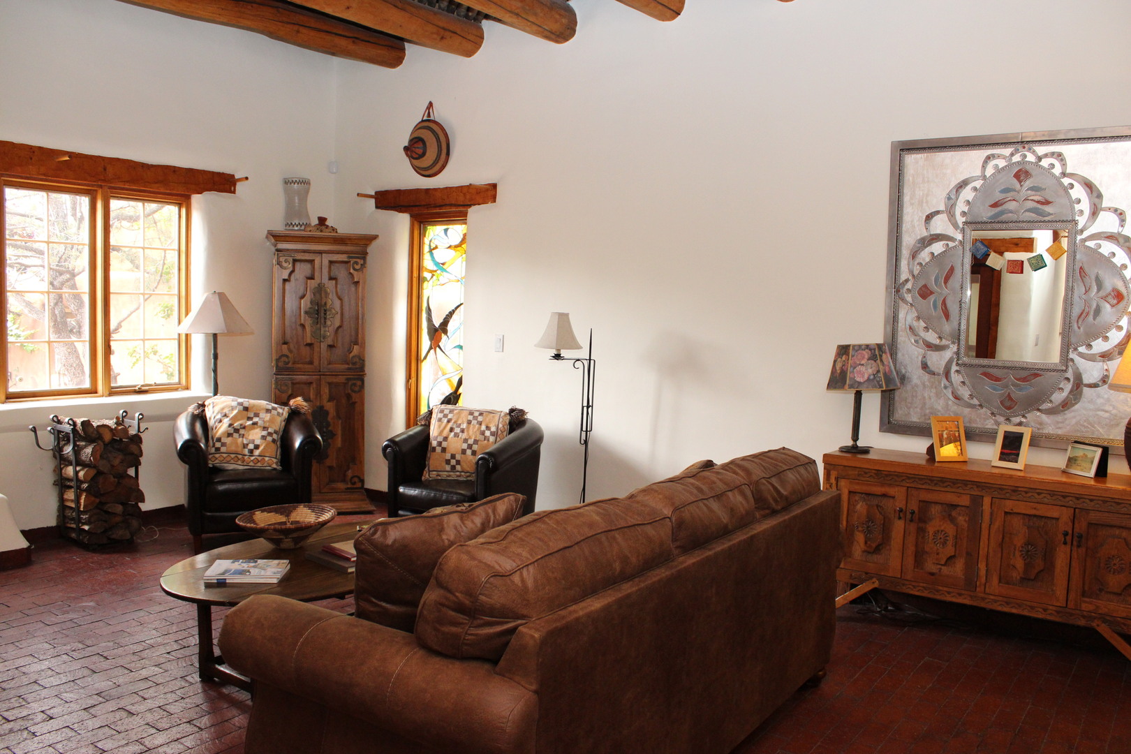 Featuring large living room with Kiva fireplace, beautiful stained glass windows in many rooms, traditional viga ceilings, fully equipped kitchen and skylights throughout. Brick floors throughout with Radiant floor heating. There is a large dining room area that opens up to the private garden courtyard for easy outdoor entertaining. Off the living room is a separate sitting area with flat screen TV plus small game table to play cards or put a puzzle together.