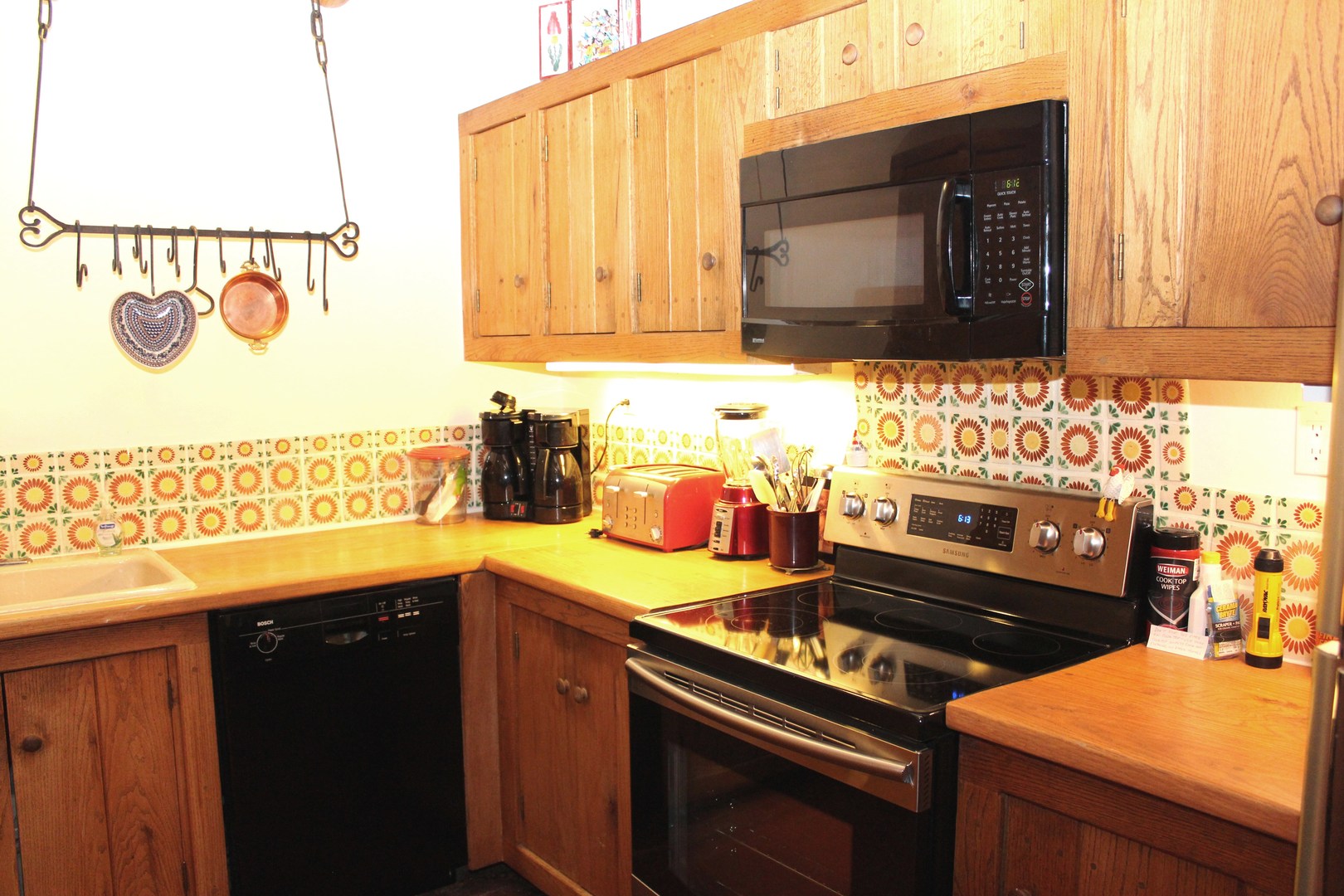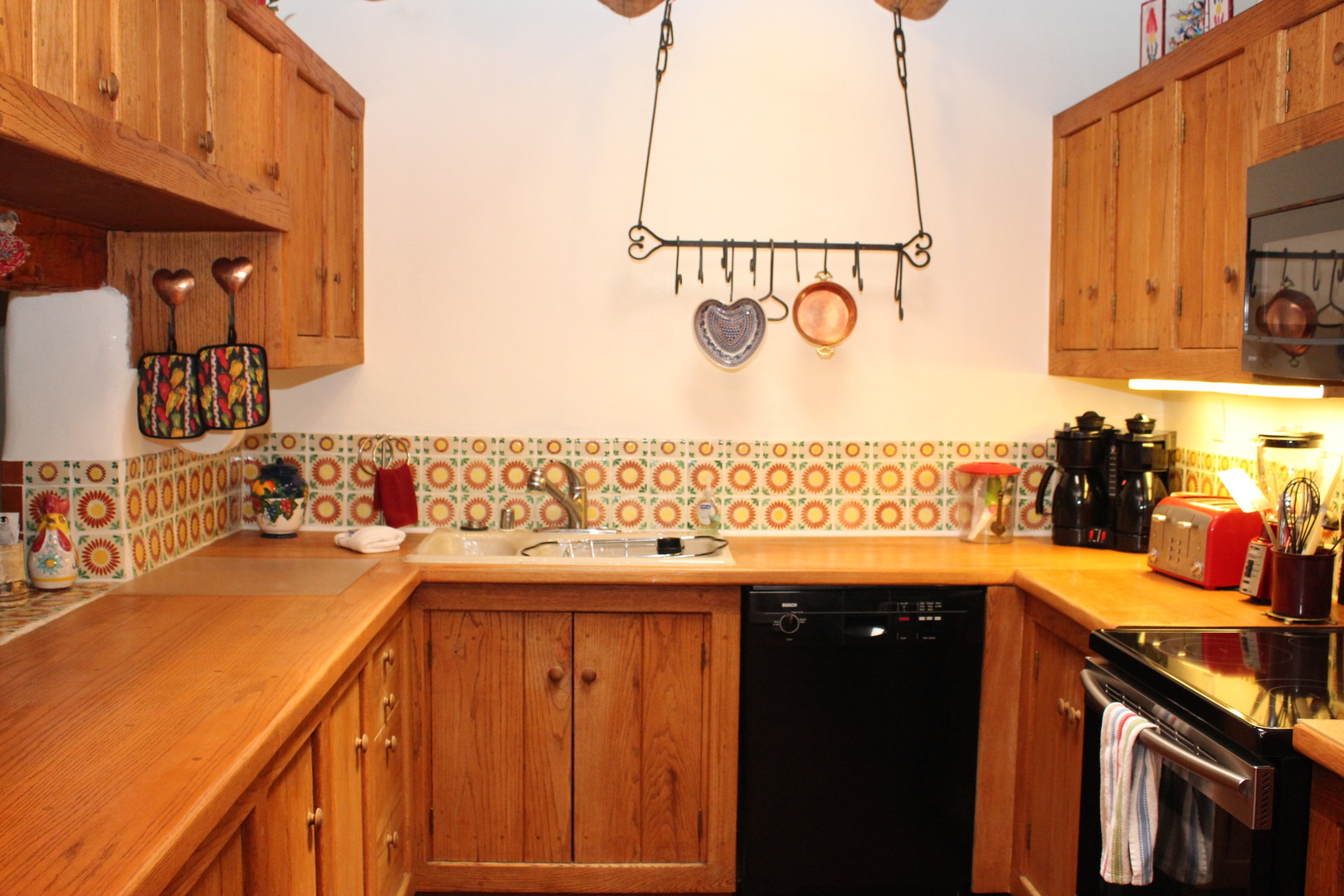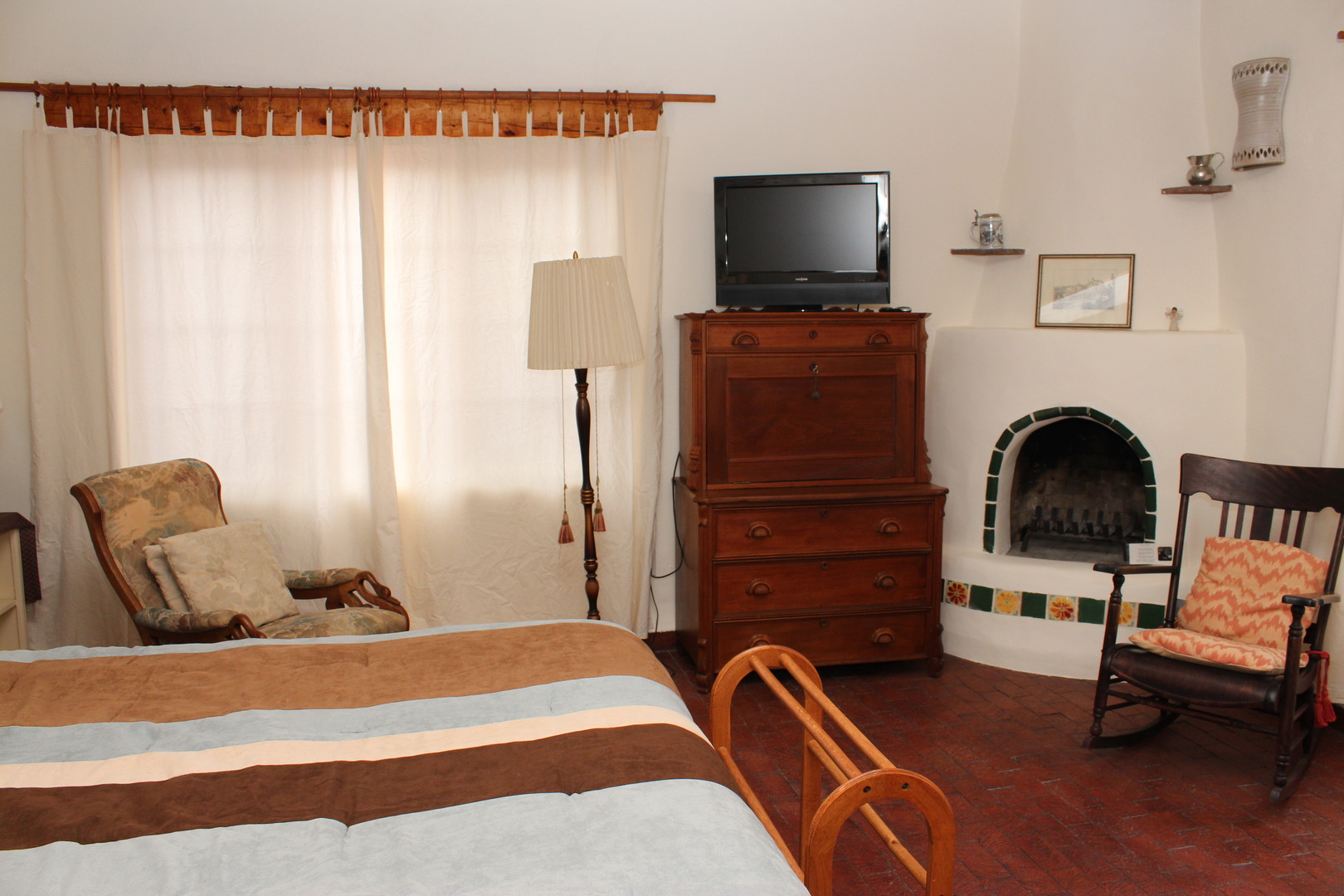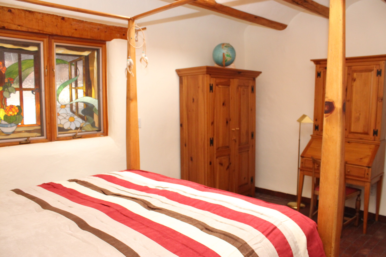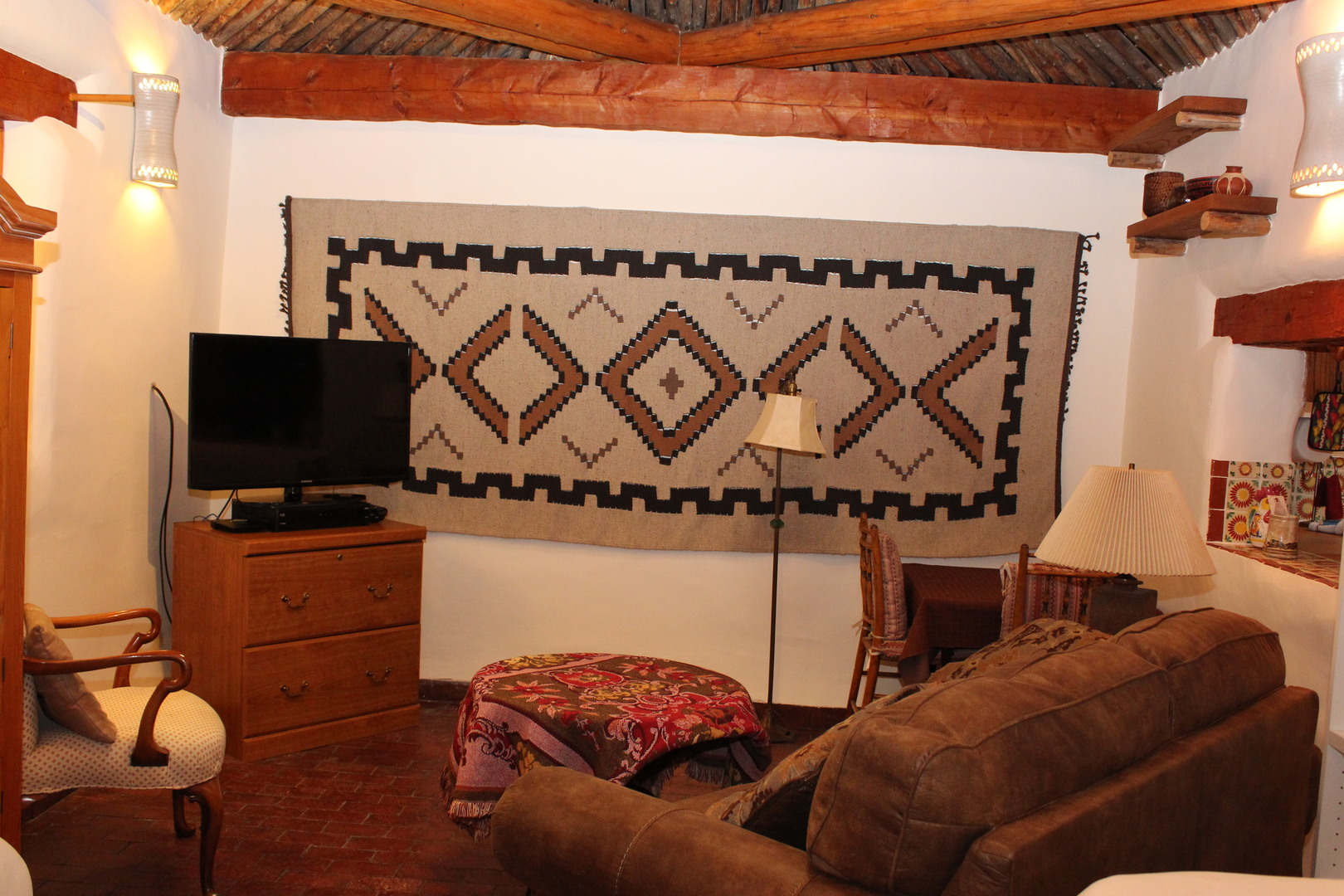 Featuring large living room with Kiva fireplace, beautiful stained glass windows in many rooms, traditional viga ceilings, fully equipped kitchen and skylights throughout. Brick floors throughout with Radiant floor heating. There is a large dining room area that opens up to the private garden courtyard for easy outdoor entertaining. Off the living room is a separate sitting area with flat screen TV plus small game table to play cards or put a puzzle together.